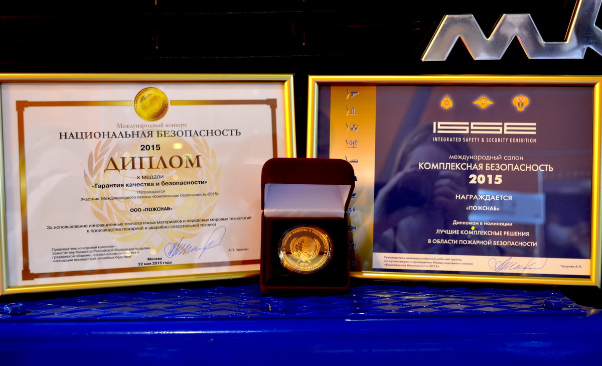 22 мая на торжественном закрытии VIII Международного салона «Комплексная безопасность 2015» ООО «ПОЖСНАБ» были вручены диплом и золотая медаль за «Использование инновационных технологичных материалов и передовых мировых технологий в производстве пожарной и аварийно-спасательной техники».